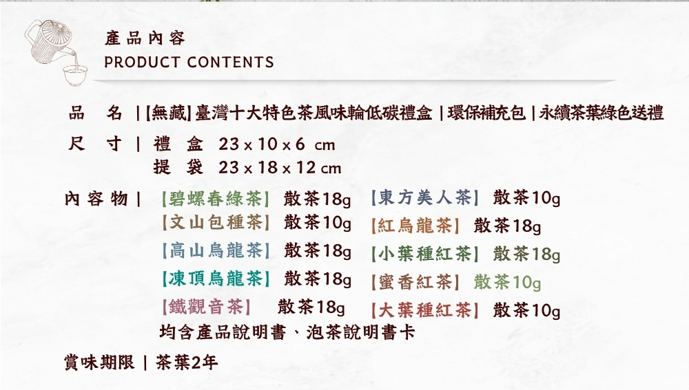 【碧螺春綠茶】散茶18g、【文山包種茶】散茶10g、【高山烏龍茶】散茶18g、【凍頂烏龍茶】散茶18g、【鐵觀音茶】 散茶18g、【東方美人茶】散茶10g、【紅烏龍茶】散茶18g、【小葉種紅茶】散茶18g、蜜香紅茶】散茶10g、【大葉種紅茶】散茶10g。均含產品說明書、泡茶說明書卡、均附提袋
