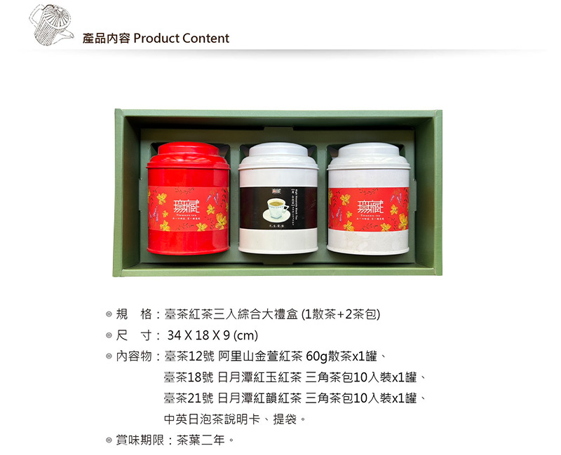 內容物:金萱紅茶60gx1罐、日月潭臺茶18號 紅玉紅茶三角茶包10入裝x1罐、日月潭臺茶21號 紅韻紅茶三角茶包10入裝x1罐。 附提袋