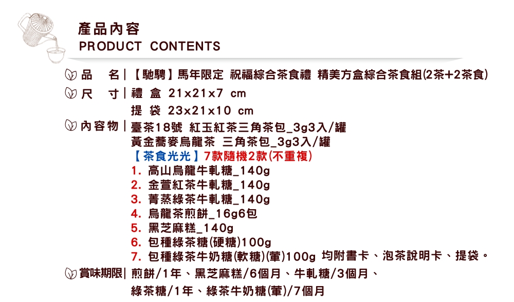保存期限:茶葉2年、煎餅1年、黑芝麻糕6個月、牛軋糖3個月、綠茶硬糖1年、牛奶糖(葷)7個月。