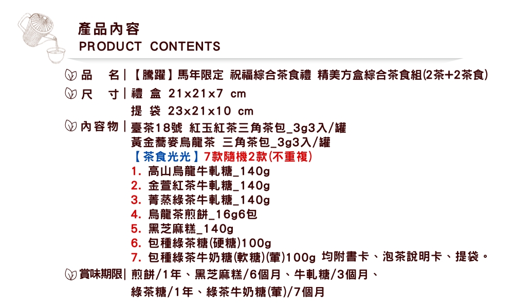 保存期限:茶葉2年、煎餅1年、黑芝麻糕6個月、牛軋糖3個月、綠茶硬糖1年、牛奶糖(葷)7個月。
