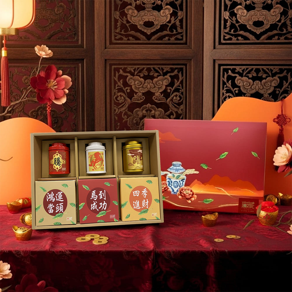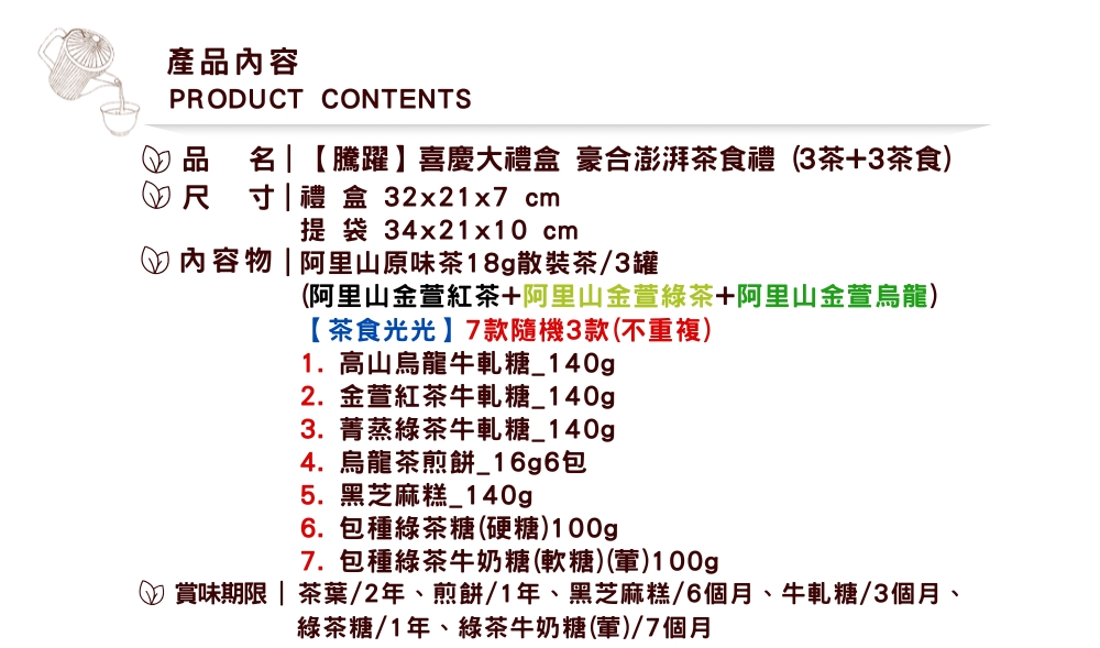 內容物:金萱紅茶18gx1罐、金萱綠茶18gx1罐、金萱烏龍18gx1罐、茶食7款隨機3(烏龍茶煎餅16gx6包、紅茶/烏龍/綠茶牛軋糖x140g、黑芝麻糕x140g、包種綠茶硬糖100g、包種綠茶牛奶糖(葷)100g) 、提袋、書卡。