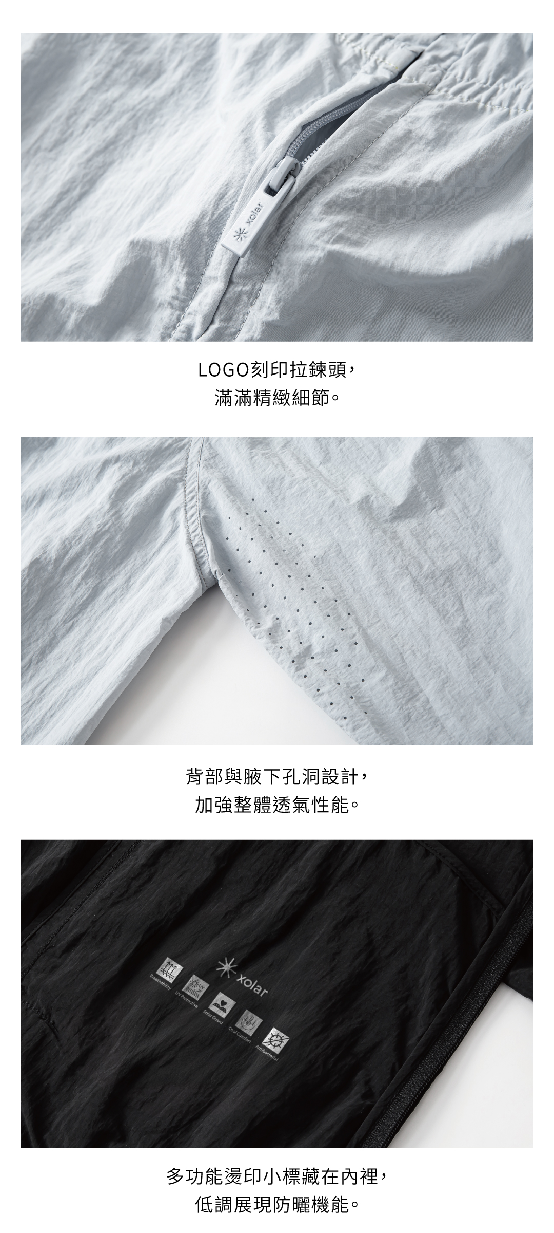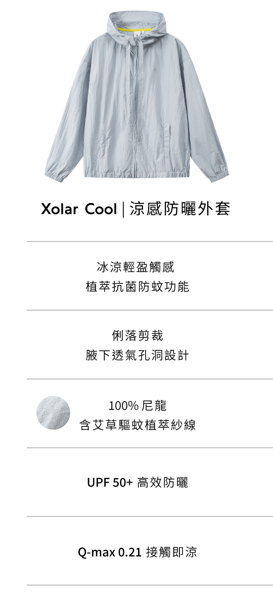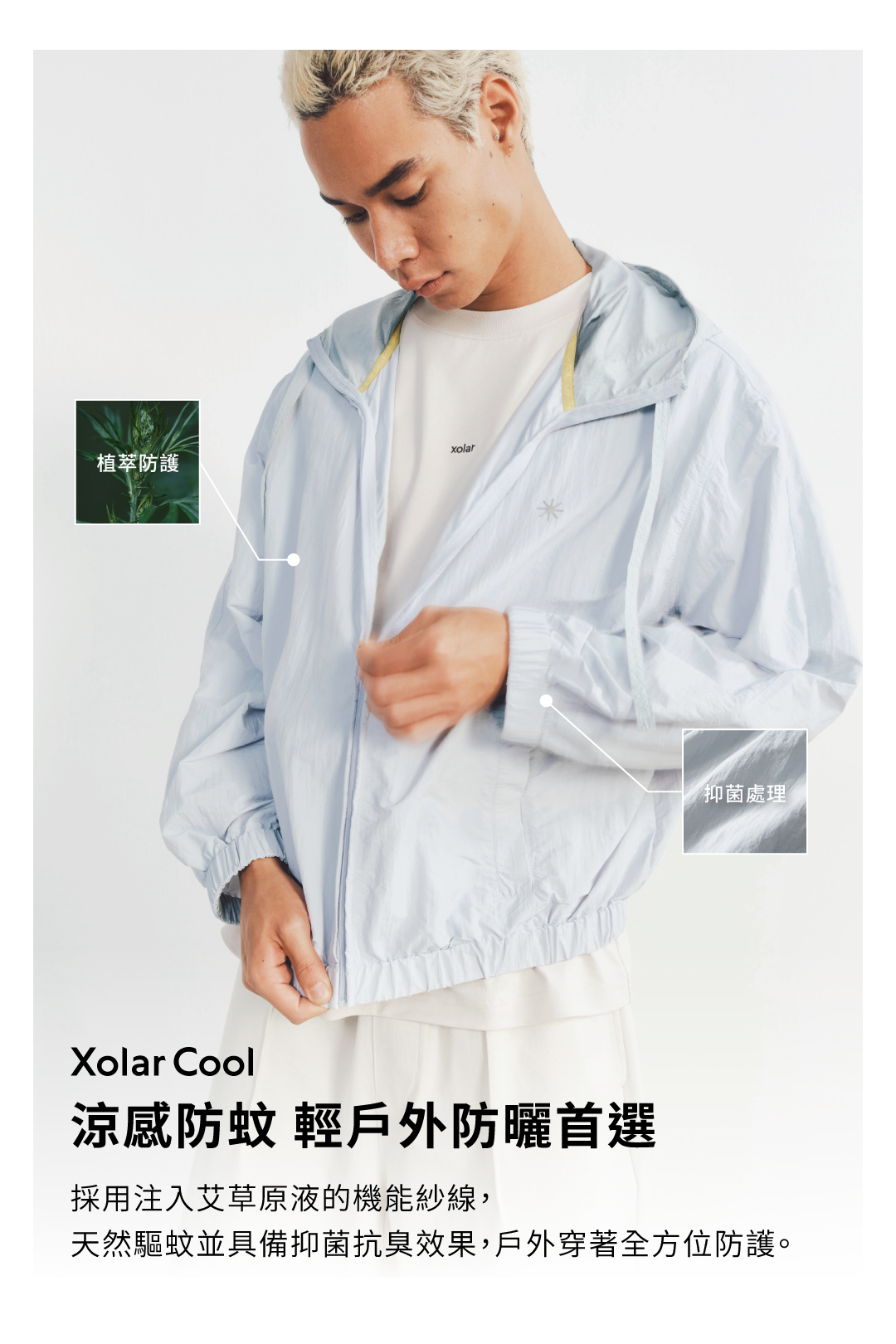 Xolar Cool 是專為悶熱氣候設計的高機能外套,將高效防曬瞬效涼感天然植萃防護集於一身!採用UPF50+防護高規格涼感布料,能有效阻隔超過98%的紫外線,結合背部與與腋下隱藏式透氣孔設計,提供卓越的透氣性,讓您穿上即刻降溫。還使用獨家艾草原液紗線,具備天然驅蚊與抑菌效果!一件Xolar Cool,讓您無論通勤、戶外活動,都能享受涼爽、舒適且全方位的防護。