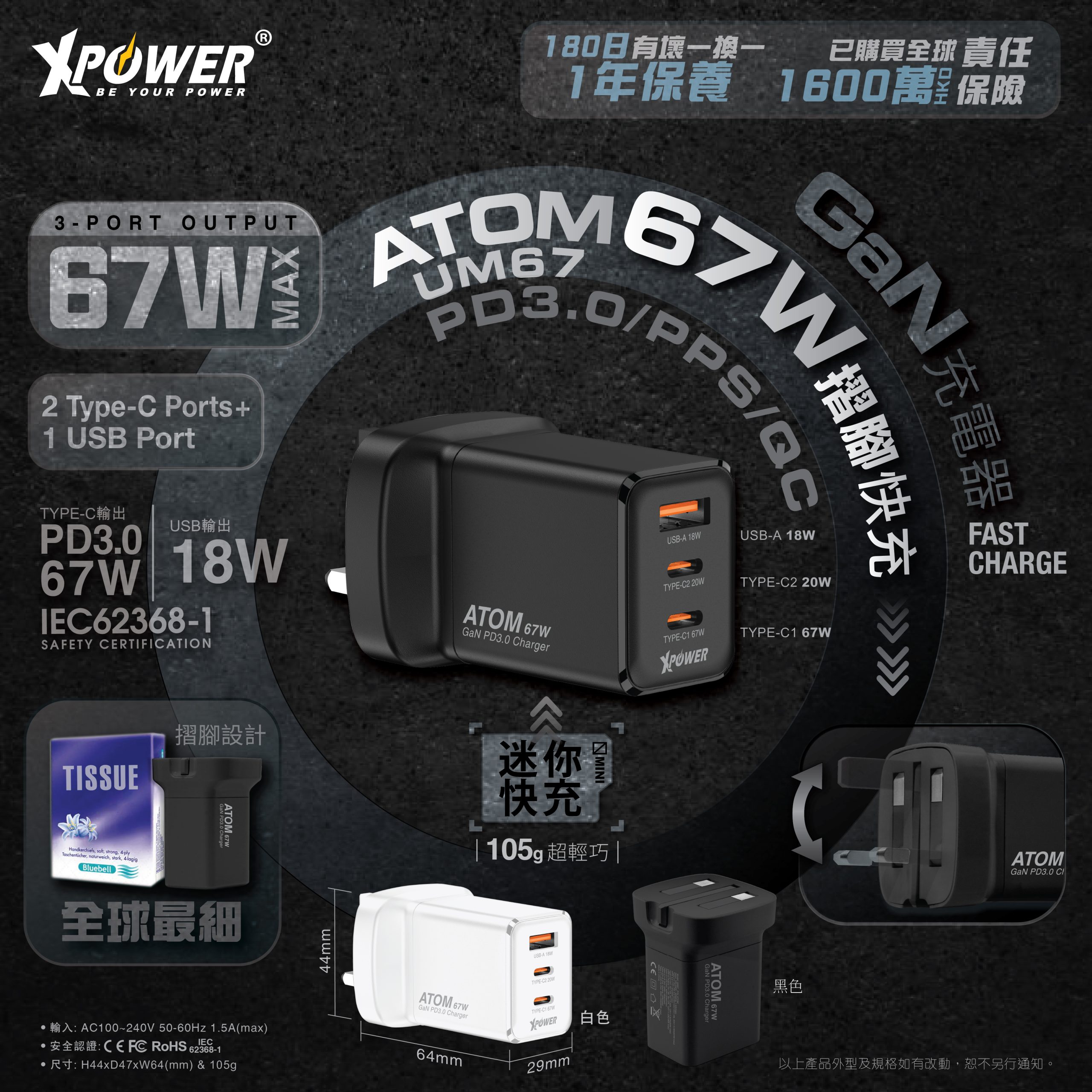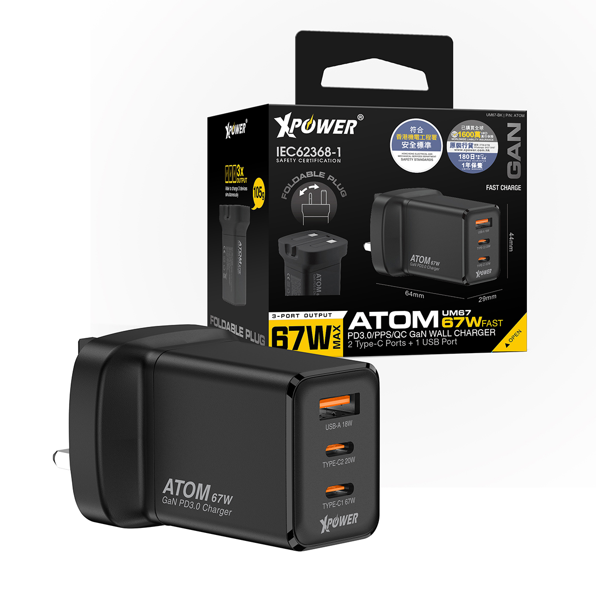 ATOM 67W PD3.0/PPS/QC迷你摺腳快充GaN充電器