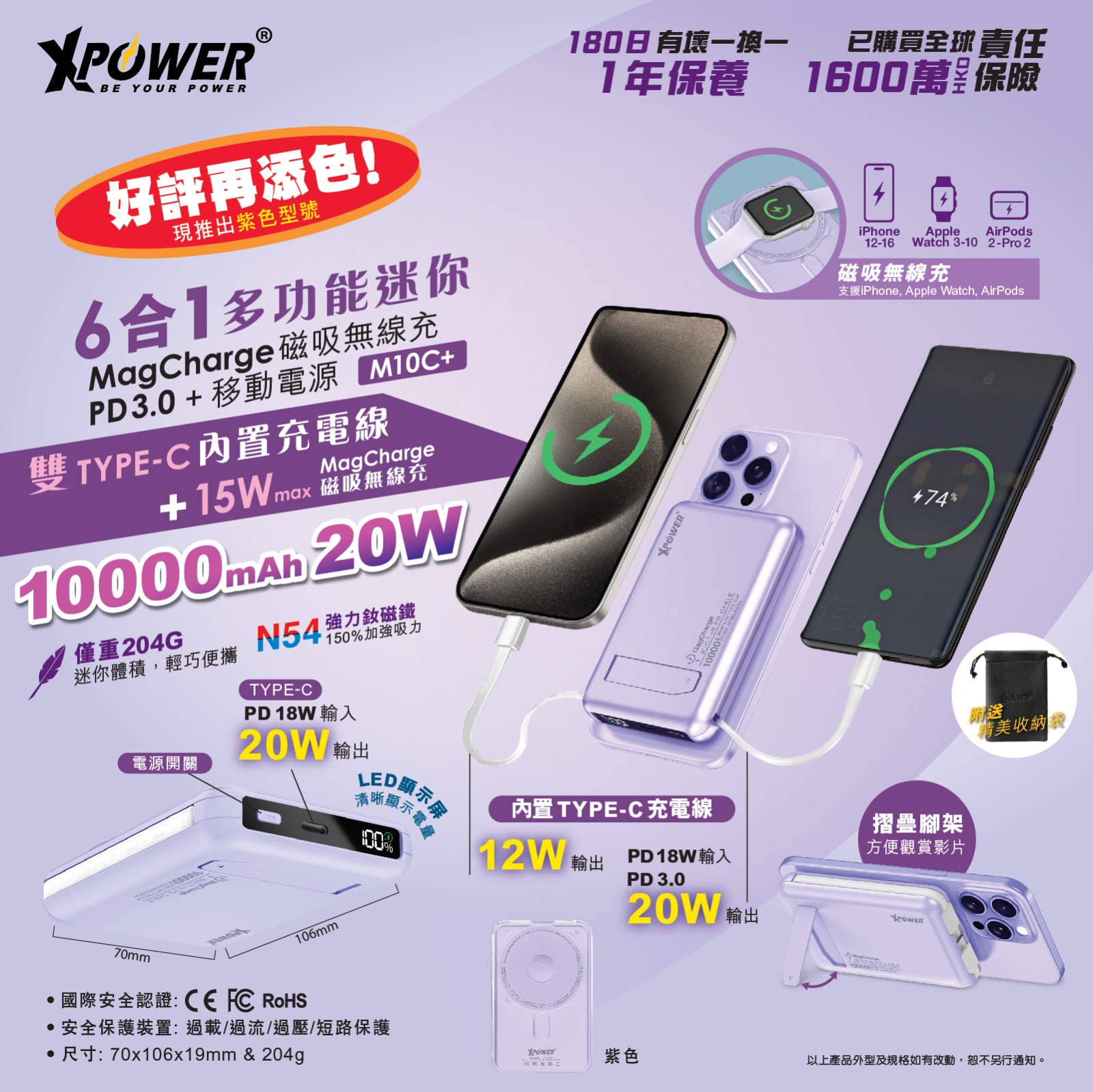 * Magnetic無線快充(15W): 支援iPhone, Apple Watch, AirPods