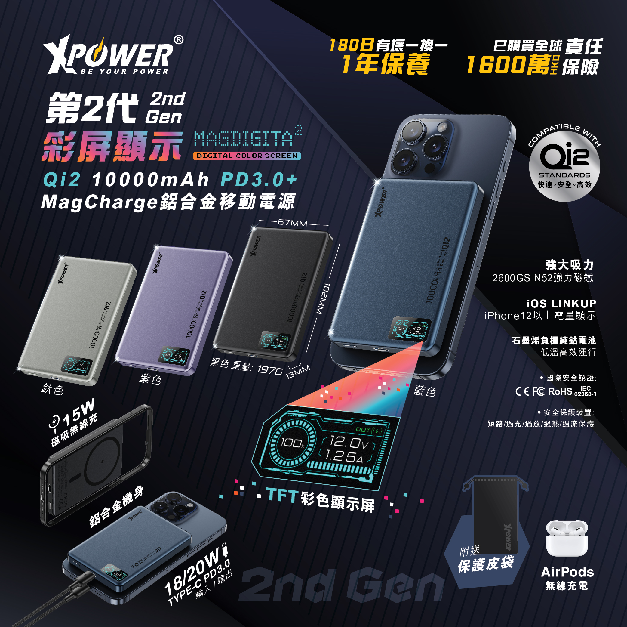 MagDigita² 第2代 彩屏顯示 鋁合金外殼10000mAh PD3.0+QI2 磁吸移動電源