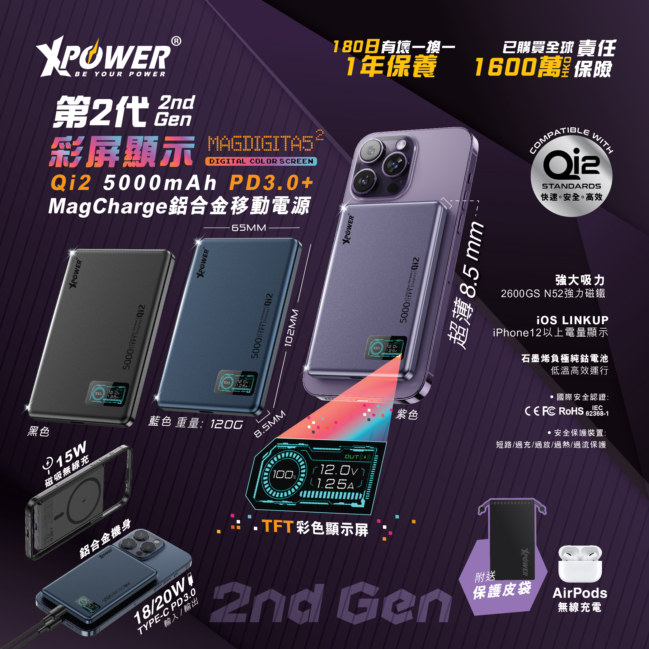MagDigita5² 第2代 彩屏顯示 鋁合金外殼5000mAh PD3.0+QI2 磁吸移動電源