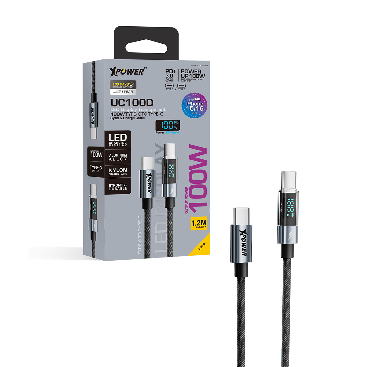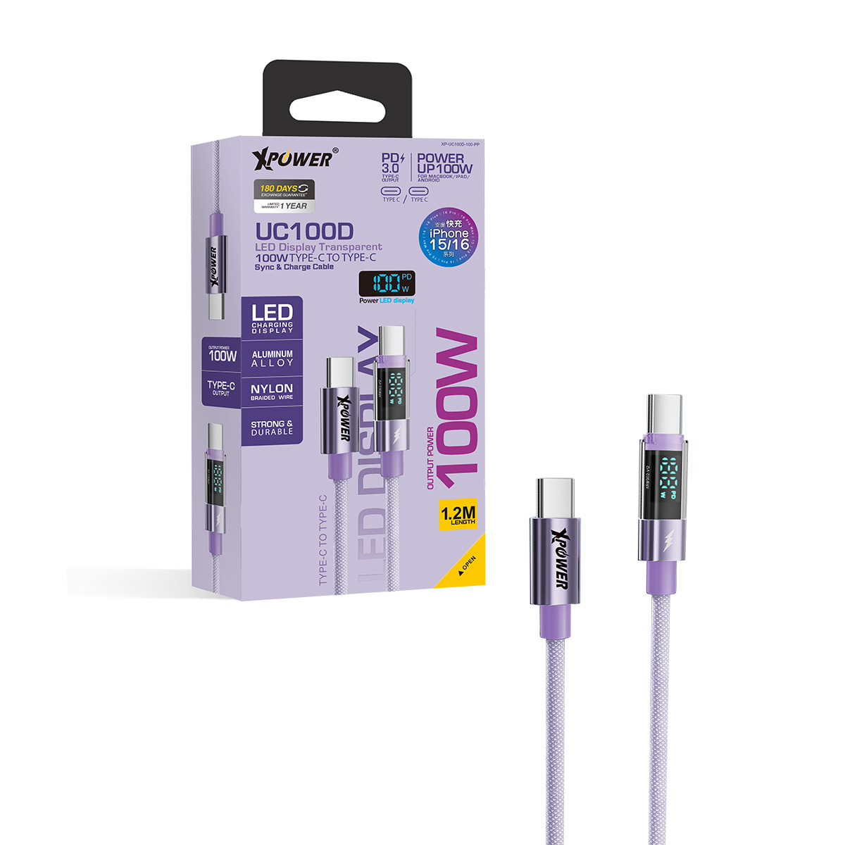 UC100D 1.2M LED顯示 100W高速傳輸充電 Type-C>Type-C線