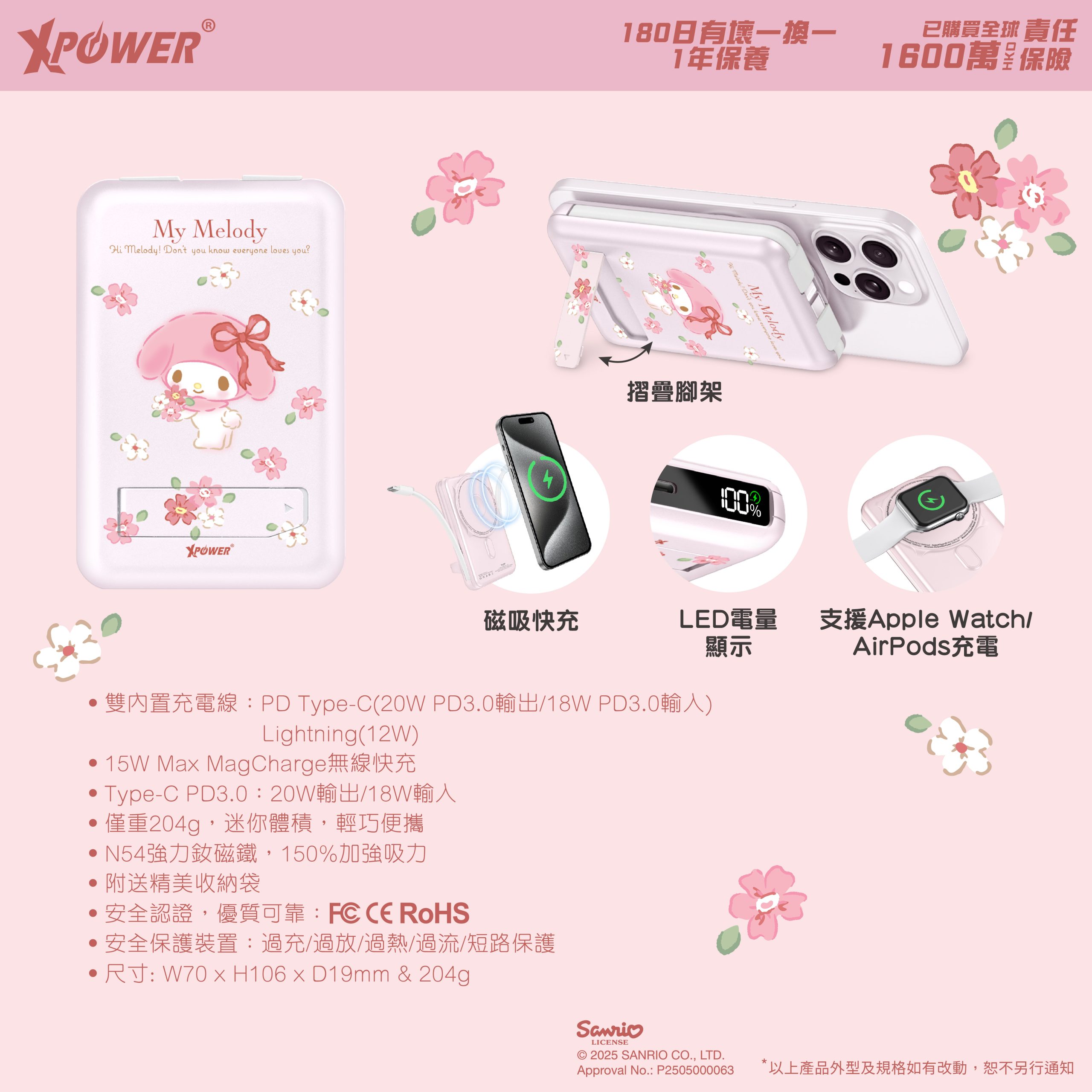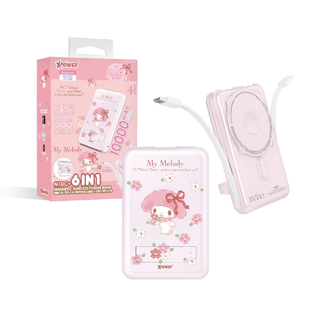 XPower x Sanrio My Melody M10C+ 6合1 10000mAh多功能迷你20W PD3.0+ 磁吸無線快充移動電源